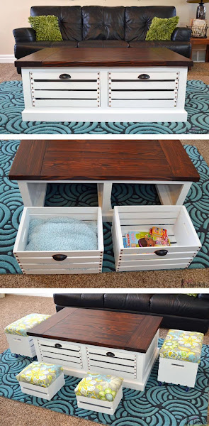 Si miran las imágenes verán como de un solo mueble, como lo es la mesa de centro podemos organizar un espacio funcional, versátil y útil con cajoneras para el guardado de revistas, almohadones o juguetes.