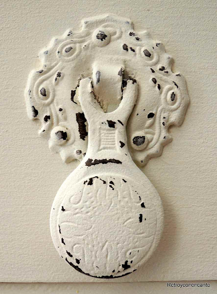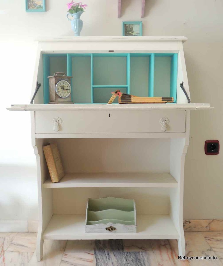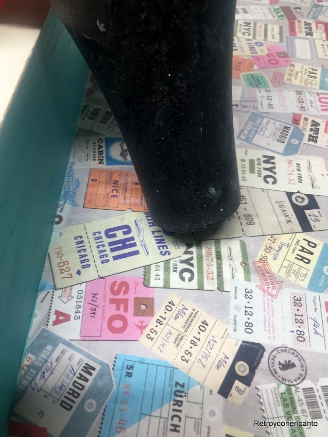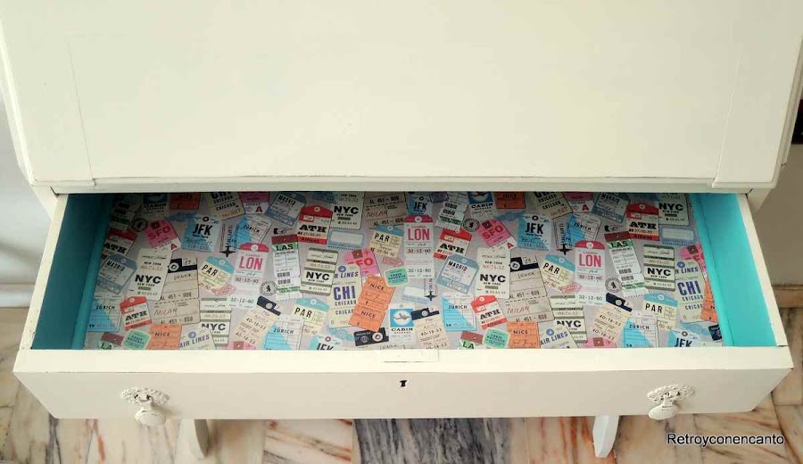 El interior del cajón lleva, además de pintura color turquesa, la base forrada con decoupage. ¡Nuestro secador que no falte!
