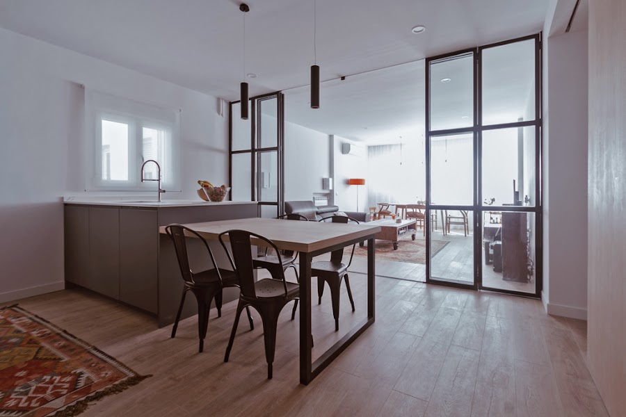 Para ello, nada mejor que una división de vidrio, formada por paneles plegables en cuadrículas de forja, que se pueden abrir o cerrar según lo requiera la ocasión. Esto permite una conexión visual constante, gracias a la cual se produce una sensación de amplitud inigualable y una luminosidad natural que antes no tenía. En definitiva, un espacio flexible y sin límites visuales.