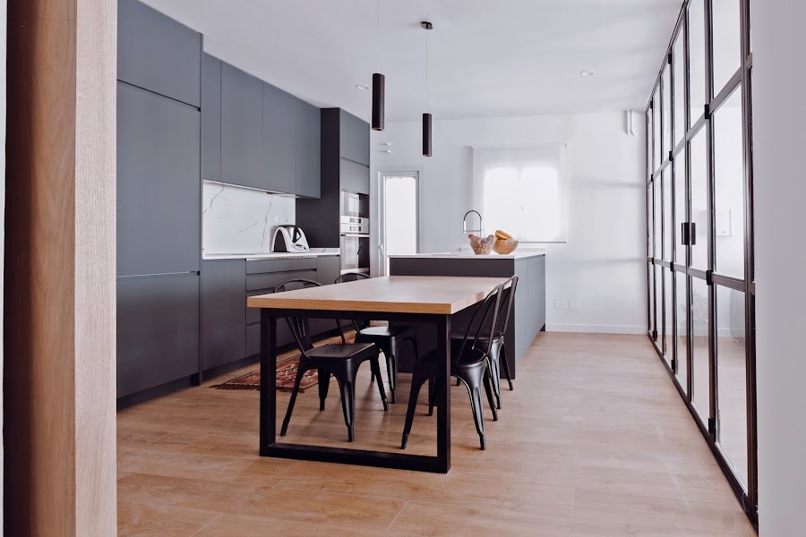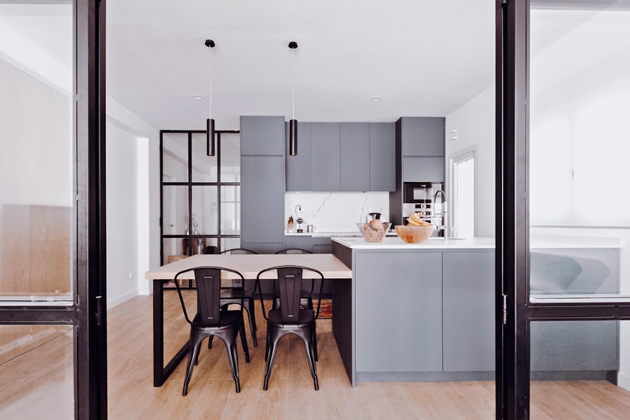 El modelo es de material laminado gris mate y sin tirador, que combinado con las vetas de la encimera que imitan al mármol Carrara, la madera presente en la mesa y diversos elementos decorativos clásicos, hacen de éste conjunto entre nórdico e industrial, una opción fresca y vanguardista a tomar en cuenta.