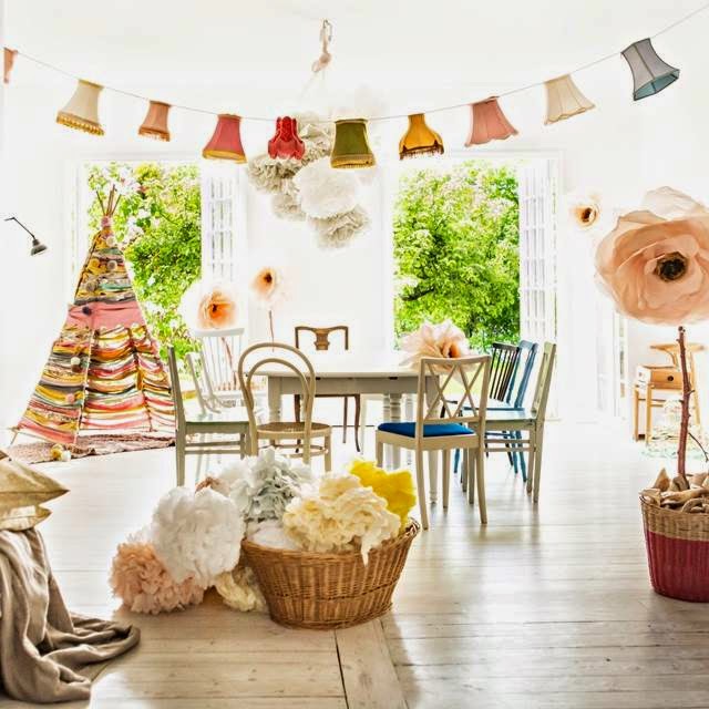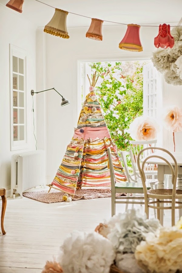 No puede ser mas original y delicado este espacio infantil decorado con una guirnalda de tulipas de lámparas. Dicha guirnalda esta realizada con tulipas de diferentes formas y colores colocadas en una cuerda que enmarca el comedor de la vivienda, estancia que a la vez se utiliza como espacio de juegos infantil. Si uno es capaz de apartar la mirada de esa fantástica guirnalda puede observar un colorido tipi con retales de telas, que también forma parte de este extraordinario espacio.