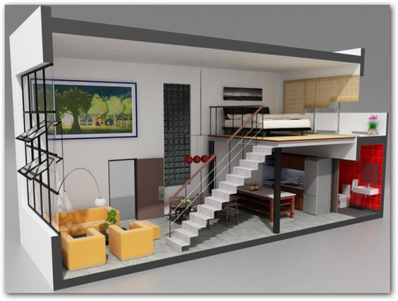 Este plano da una solución de aprovechamiento del espacio, creando un altillo donde se ha ubicado el ambiente de descanso.