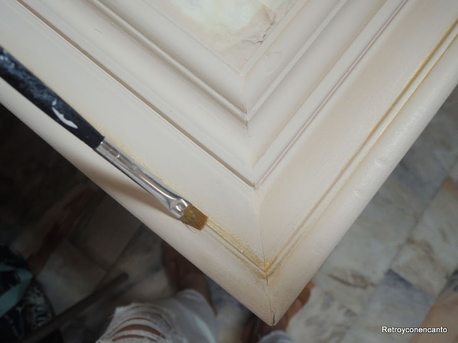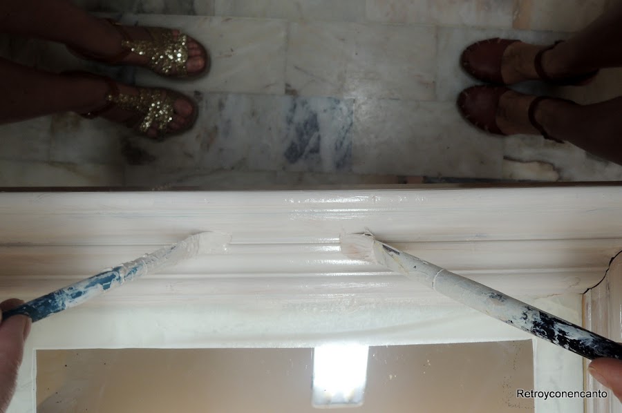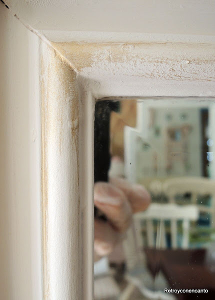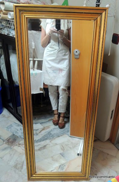 La dueña del espejo quería que sacáramos, con la lija, algún detalle de la pintura dorada original. Lo intentamos, pero esa capa era tan fina y frágil, que solo conseguíamos que se viera el color rojo inglés que la sustentaba. Así que, optamos por dar ligeros toques dorados con el pincel muy escurrido, en las cuatro esquinas...,