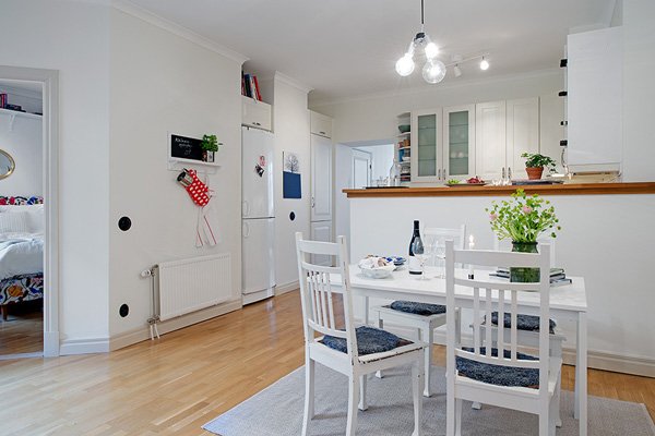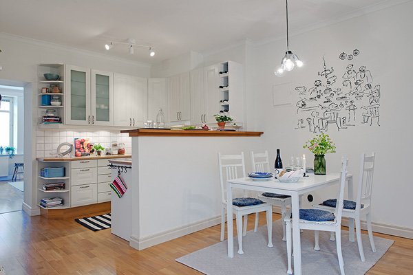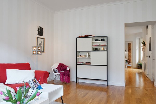 La sala de estar también se ha decorado con papel pintado, en este caso bastante más sutil que el del recibidor con rayas en blanco y blanco roto.