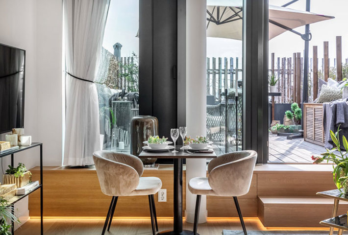 por su impresionante terraza. Los poquitos metros de su interior también nos cautivan.