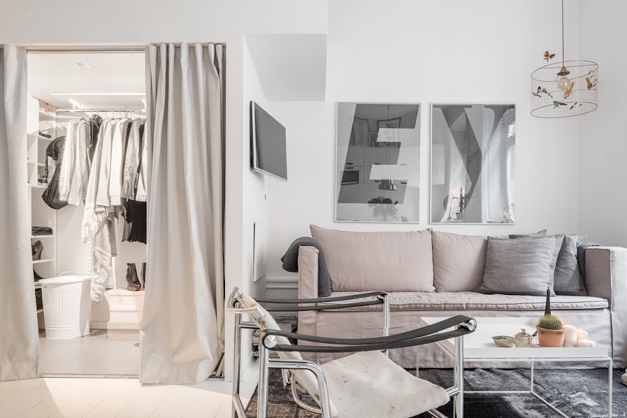 Después de la cocina, lo que más me ha llamado la atención es que en tan pocos metros cuadrados, hayan optado por tener un vestidor. Pero creo que es un pequeño lujo que encaja perfectamente en el espacio. ¡Otro 10 para esta idea!