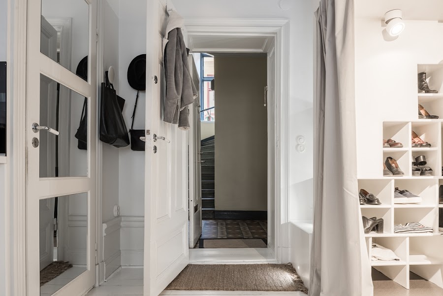En esta vista de la puerta de la entrada, se puede ver la parte del vestidor y la puerta del baño en la que han colocado espejos para reflejar la luz y de paso, ver lo guapos que salimos de casa.