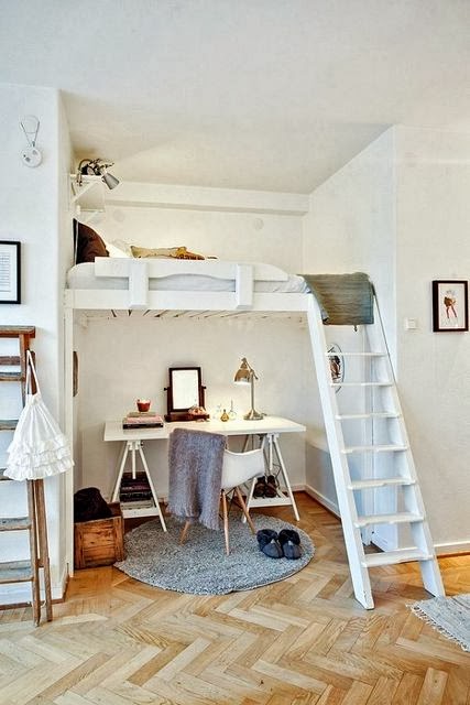 Multiplicando la astucia: una contribución significativa de la luz a través de la ventana de la bahía y las paredes blancas, los elementos dispuestos verticalmente, como la cama para liberar el espacio en el suelo. Un arreglo perfecto, inteligente y lleno de creatividad Made in Sweden .