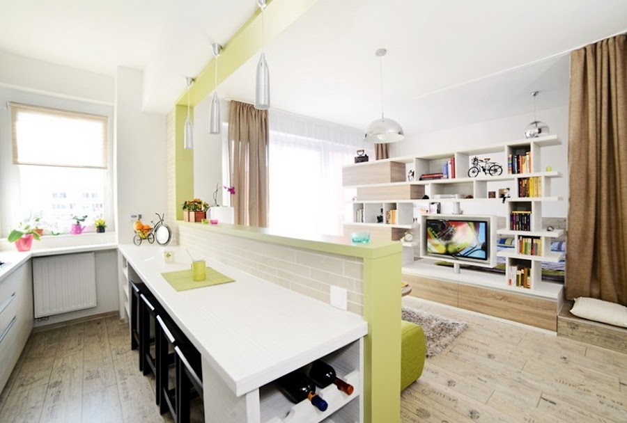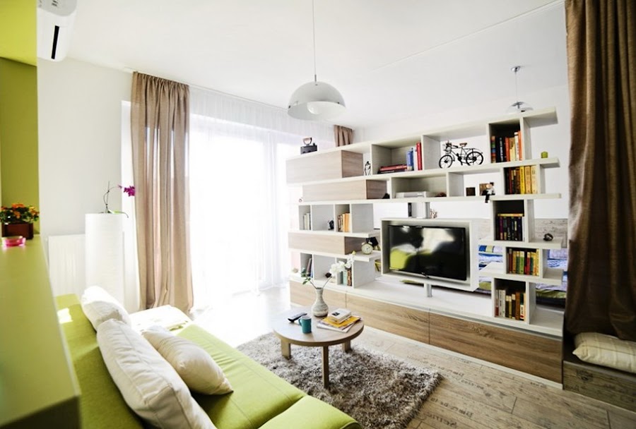 El apartamento es sencillo, pero con una decoración moderna y cuidada llena de detalles. El mueble estantería del salón hace de separación con el dormitorio y el pequeño despacho, dejando pasar la luz, y eliminando la sensación de agobio que nos podría ocasionar un estudio de reducidas dimensiones a la vez que proporciona algo de intimidad a la zona de descanso.