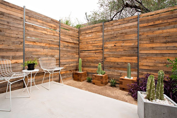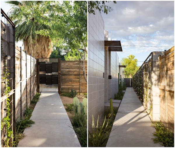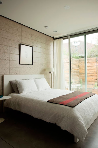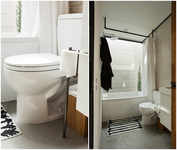 Los paneles de cristal, mucho más ligeros, se utilizan para cerrar el cuarto de baño, así como para crear una pared que cierra la vivienda, dejando pasar toda la luz posible. Además, esas puertas correderas permiten el acceso al pequeño jardín que está al fondo (como os decía, no le falta de nada!)