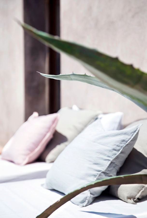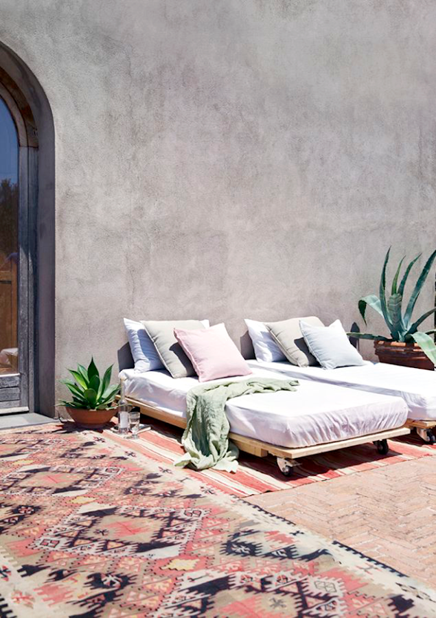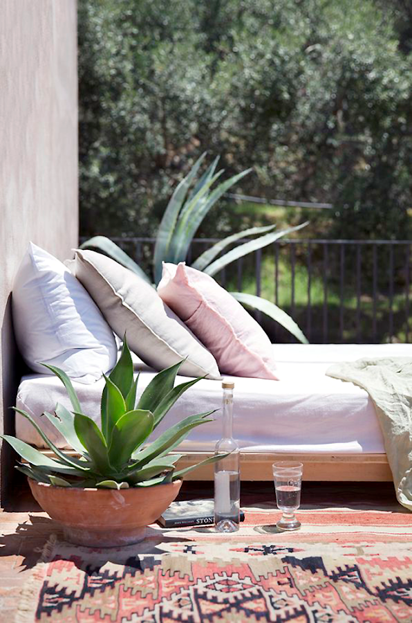 Sé que estamos en pleno Septiembre y que la temporada que llega es de temperaturas bajas y poco exterior ;-) pero teniendo en cuenta la temperatura media anual de mi isla (unos 22 grados), no puedo dejar de lado los espacios exteriores, ya que los usamos prácticamente todo el año. Lo que sí es cierto es, que podríamos adaptarlo a las condiciones de cada estación. Así que en este caso, este exterior, se trata de una vivienda de alquiler en Italia llamada FRANTOIO PUNTA CAMPANELLA, cumple con lo necesario para adaptarla a nuestro clima. Las alfombras son un complemento que me resulta muy atractivo para los exteriores ya que te permiten sentarte en ellas, además de dar un toque ideal y conseguimos a la vez que el espacio sea mas confortable durante las noches cuando refresca. Ni qué decir de estas hamacas que casi parecen camas con sus cojines, una vegetación resistente al exterior con macetas de barro que cada vez me gustan más y el resultado es impecable. Como siempre digo "menos es más".