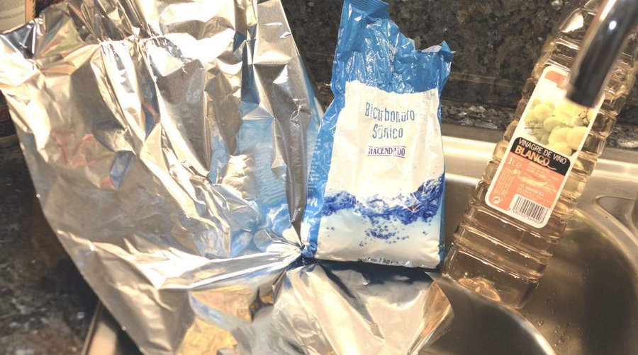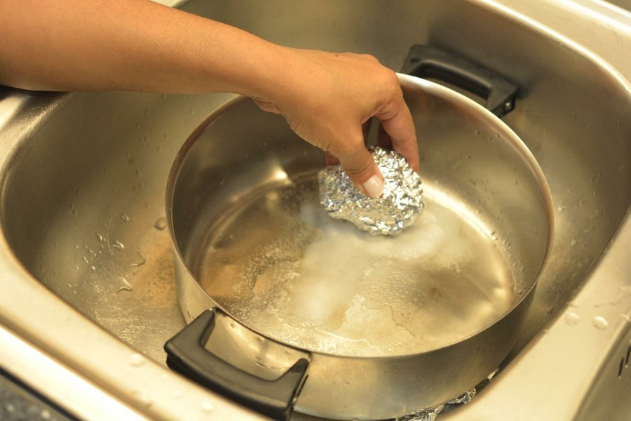 Haces una bolita con el papel de plata y frotas hasta sacar la mancha, ya verás que no es necesario frotar demasiado