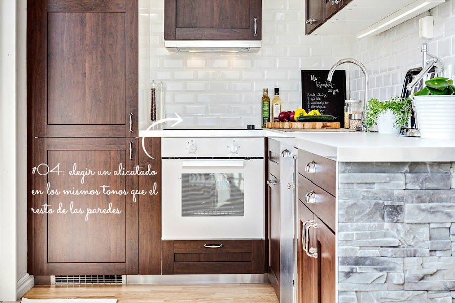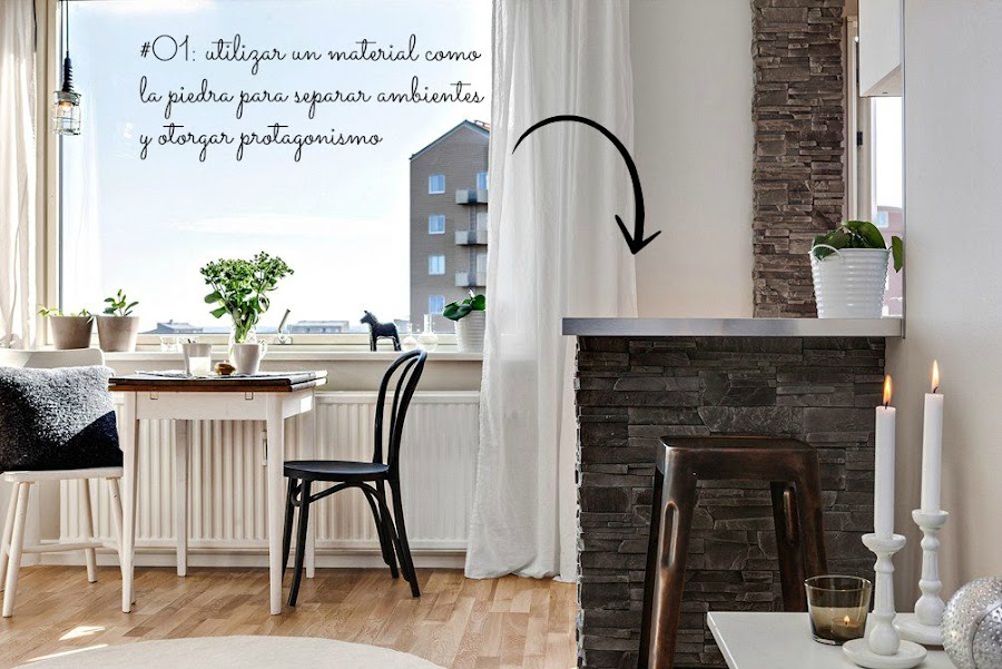 Una de las grandes ideas de decoración de este apartamento ha sido revestir de piedra tanto, la mocheta de la cocina, como la parte inferior de la barra de la misma. Se consigue así separar ambientes y otorgar protagonismo a elementos que, en un principio, pueden resultar un obstáculo o impedimento.