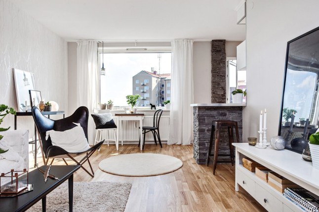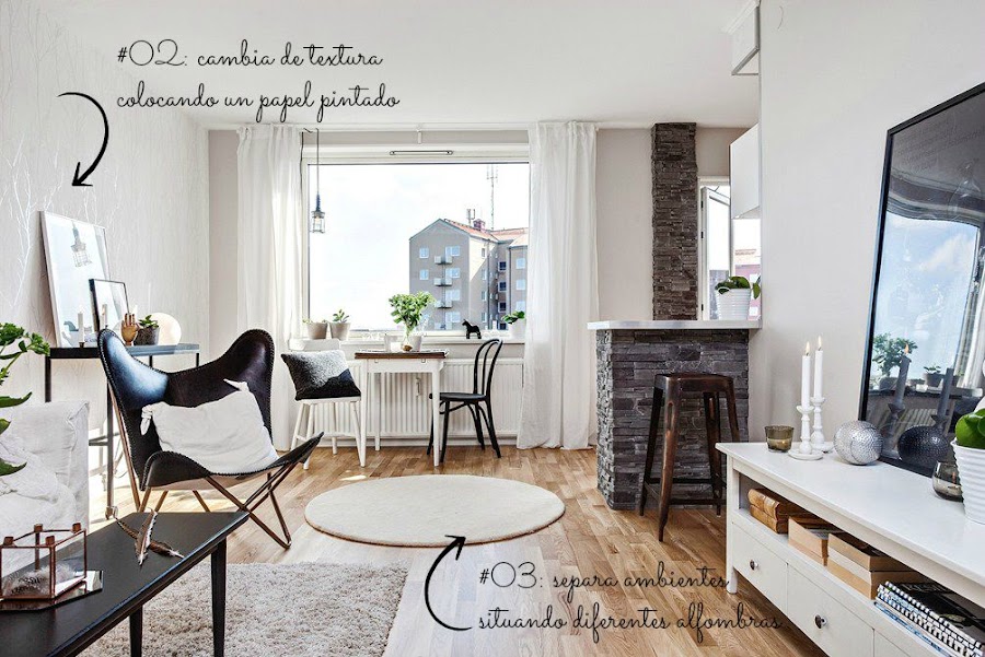 Una decoración súper estudiada, ya que en tan sólo 38m2, se ha sabido combinar a la perfección materiales tan diferentes como la madera, la piedra o el papel pintado.