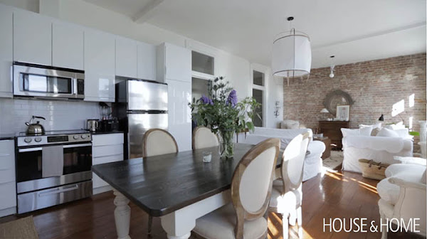 · La gran cantidad de blanco se contrarresta con el efecto industrial de las paredes de ladrillo. La frialdad, con las líneas sinuosas del mobiliario, su peso y la textura de los textiles.