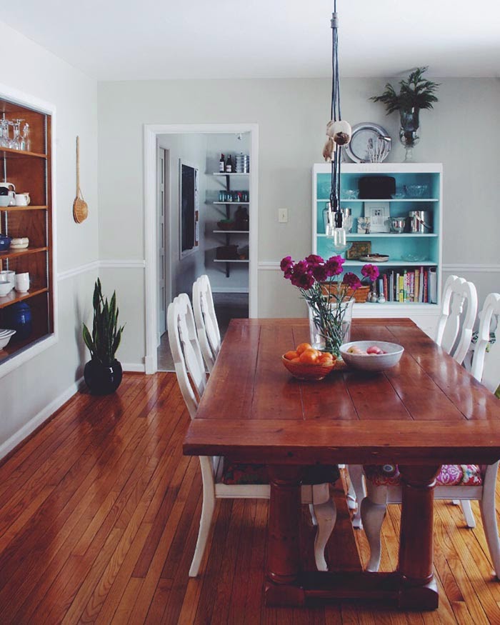 Se trata de la casa de Penelope Dullaghan, una talentosa ilustradora que vive en Indianápolis, no dejes de ver su página web. Su hogar es tremendamente agradable y acogedor. La clave es la perfecta combinación del color miel de la madera con el color blanco de las paredes, molduras y textiles.