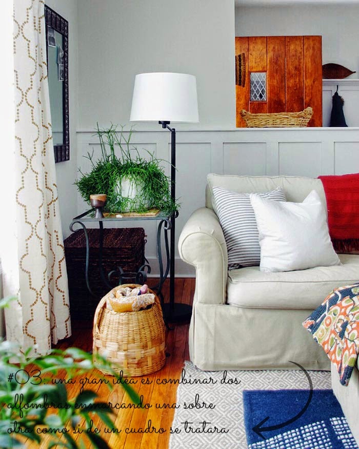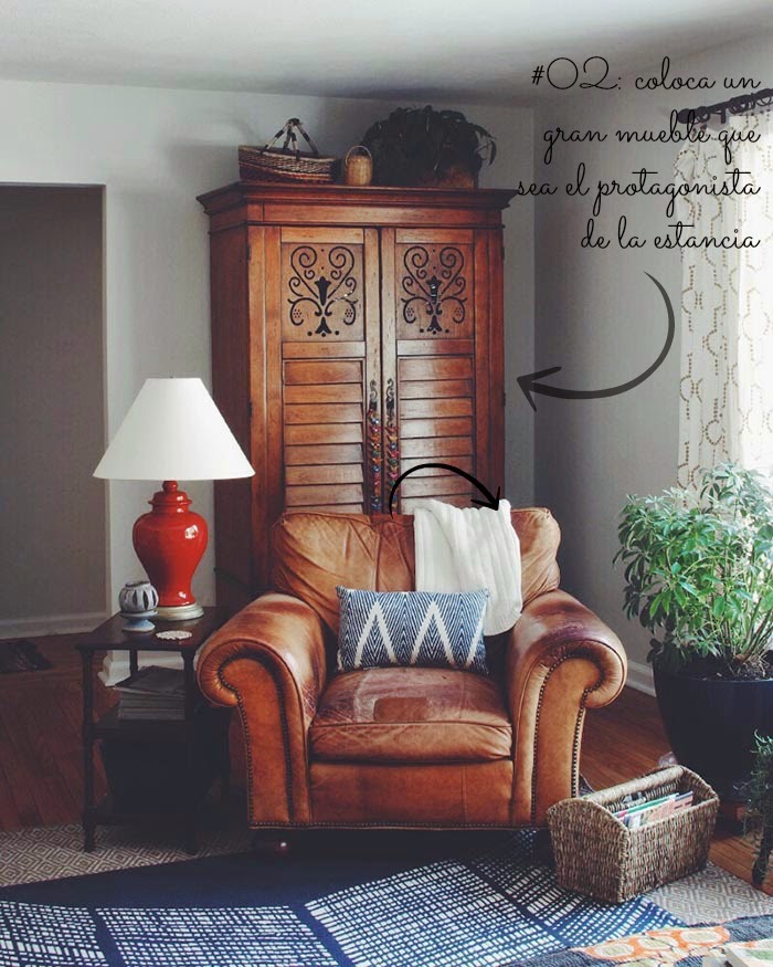 Si te fijas hay un montón de materiales reinando en este salón, pero están combinados con tanto acierto que hacen de esta estancia un lugar cálido y confortable. Textiles, en el sofá, alfombras y cortinas. Metal, en el pie de la lámpara y en la mesita auxiliar. Mimbre, en el revistero y en las cestas para guardar cojines y mantitas. Piel o cuero en el sillón individual. Y, la gran protagonista, la madera, en estupendos muebles de gran calidad.