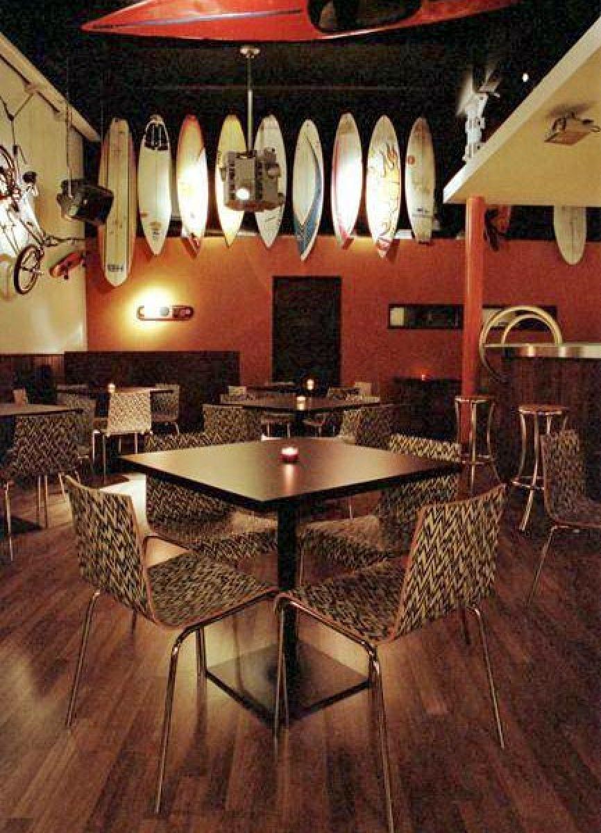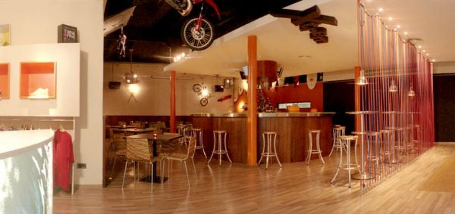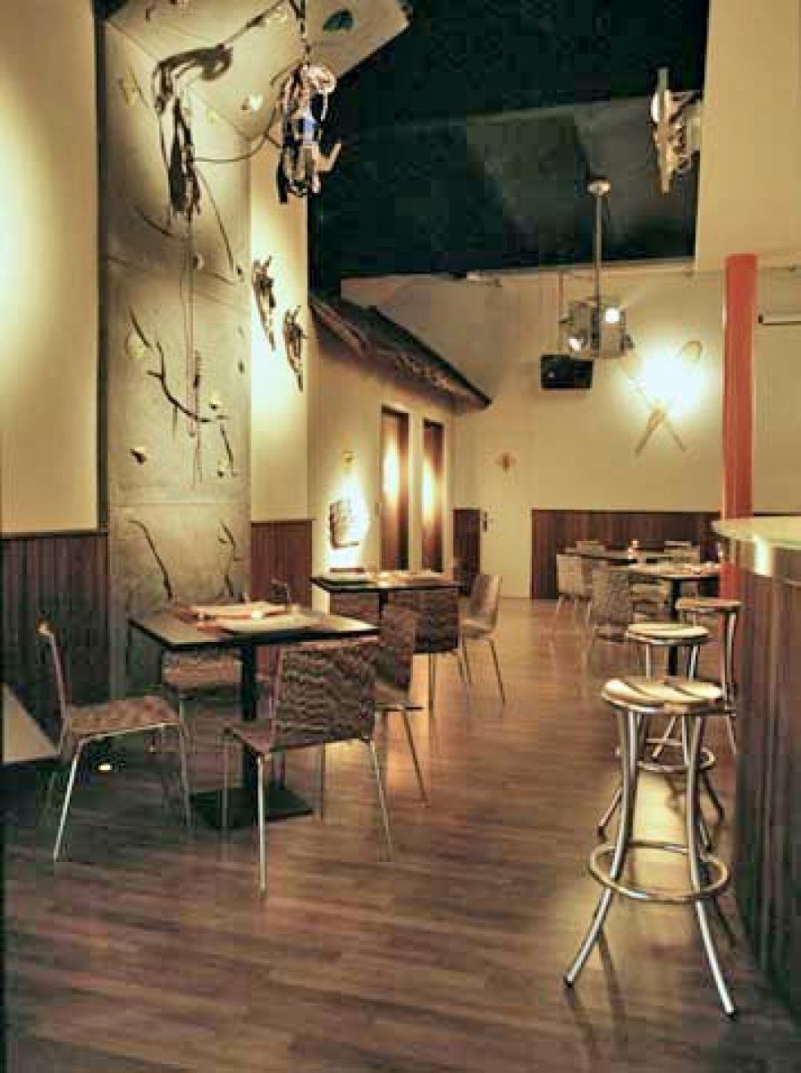 Lo primero que encontramos al entrar es una pequeña separación, diseñada con cuerdas de escalada de 10 mm. de diámetro en naranja y azul. Una vez dentro, los elementos que componen la decoración absorben nuestra mirada: una motocicleta de cross, un kaiac, una vela de windsurf y varias tablas de surf cuelgan del techo. En una de las paredes se ha colocado un rocódromo, marca Top30, que invita al cliente a practicar uno de los deportes de riesgo. En otra pared, acabada en pintura de pizarra de color negro, el visitante puede entretenerse a garabatear.