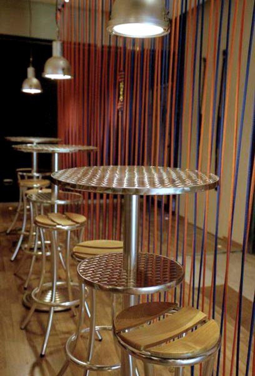 Los taburetes, de aluminio, tienen el asiento de lamas de madera. Las mesas altas de la zona de entrada también son de aluminio. Todo es de Muebles Romero.