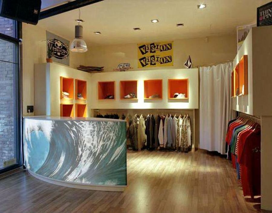 La diferencia del local la marca la tienda de ropa que se situó en la entrada. El mostrador se diseñó teniendo muy presente el mar y, por este motivo, los interioristas se inclinaron por construir una tabla de surf en volumen, cuyo frontal es la imagen de una ola.
