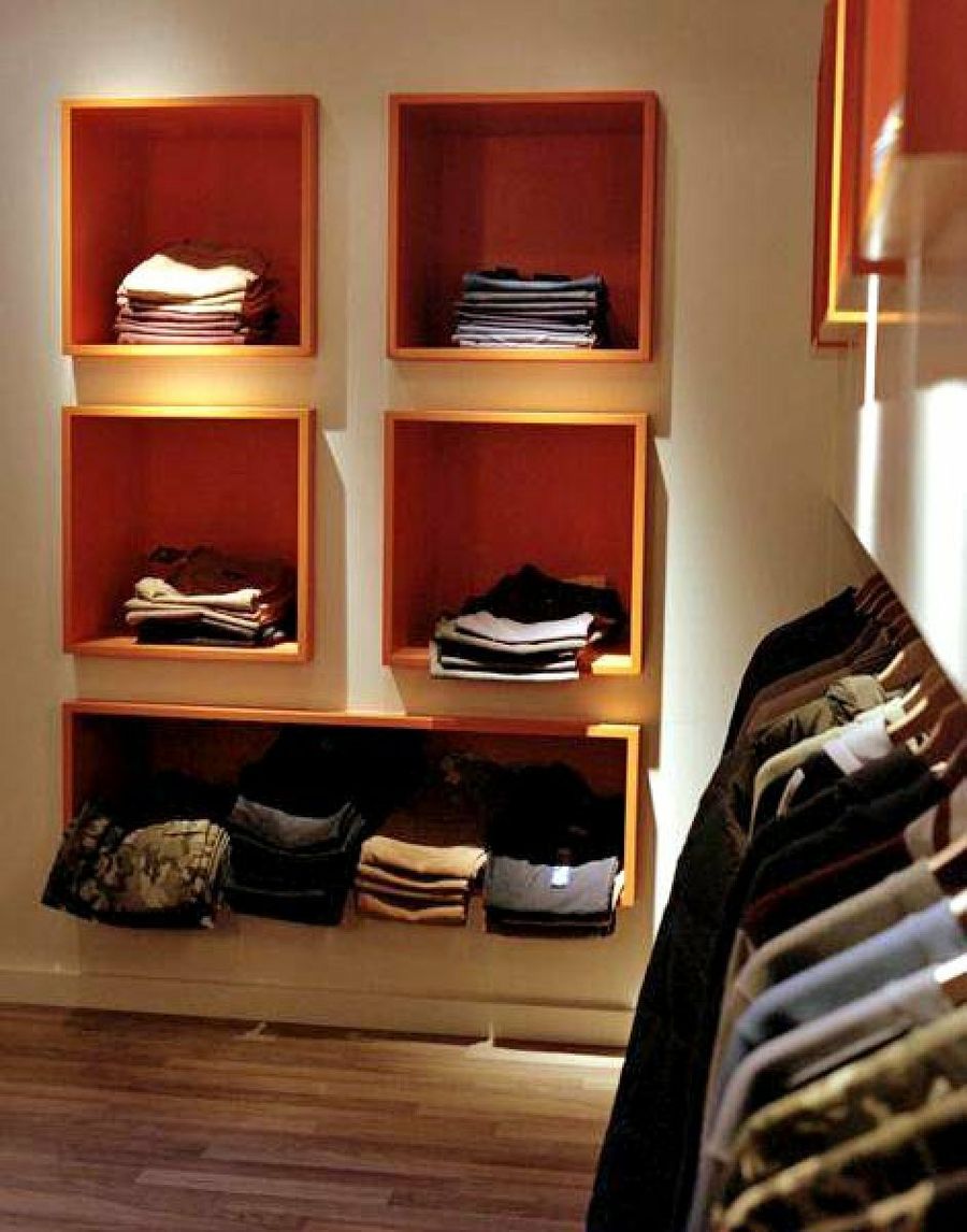 La idea era vender ropa y accesorios de deporte, por eso se diseñaron unos módulos en los que se expone ropa y accesorios en las cavidades diseñadas para ello. Todo el mobiliario de la tienda se fabricó en DM y se lacó con esmalte satinado de color blanco y naranja de la casa Valentine.