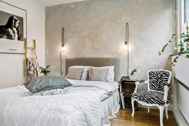 En la pared del dormitorio se juega con el muro en estado natural sin alisar al que se le ha dado el yeso con paletina emplasteciendo y creando un movimiento original, a modo de las paredes de los lofts newyorkinos. El efecto es precioso con un toque industrial en contraste con el interior tan femenino y nórdico.