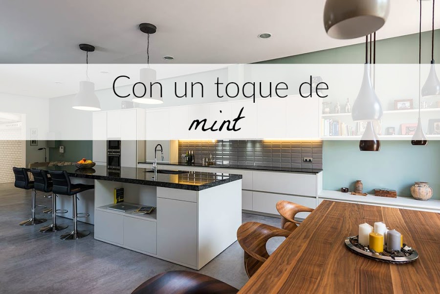 Lo primero en lo que me fijé en cuanto lo vi, fue en esa enorme pared de la cocina de color verde menta con el contraste de los ladrillos tipo metro grisáceos. Creo que es una combinación perfecta que tardará un montón en pasar de moda (y si pasa, pues se vuelve a pintar y listo, fuera miedos!).
