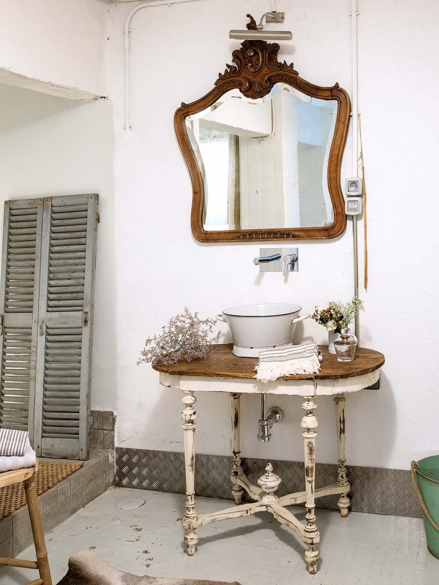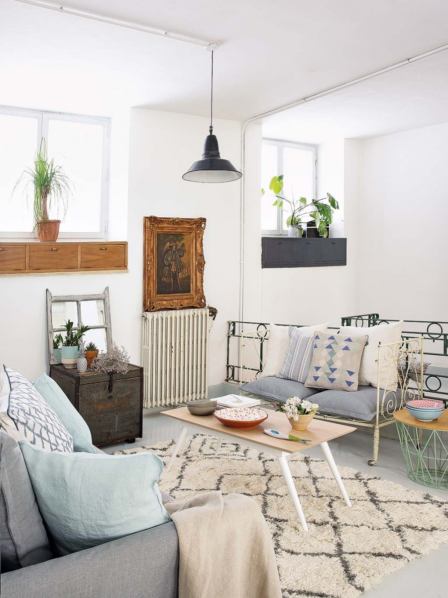 Los altos techos y el juego de diferentes tonos de blancos en paredes y suelos aportan luminosidad y sensación de amplitud y sirven de soporte a una decoración plagada de belleza obra de la dueña e interiorista Ana Setó donde a jugado a con las mezclas y un aire retro. Muebles antiguos con piezas actuales,detalles heredados o adquiridos en rastrillos junto a los textiles imprimen la nota de color.