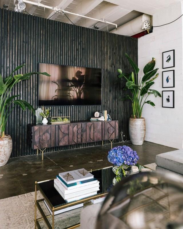 Bobby Berk La consola que usan para mueble de la TV, resulta ser una buena pieza decorativa que también brinda mucho almacenamiento, que no siempre es lo más fácil, y éste hace ambas cosas. Los espacios abiertos pueden ser abrumadores para las personas. A menudo pueden volverse fríos y estériles, pero aquí vemos que se aporta calidez a través de la textura y el color sutil, como algunos elementos de madera como se ve en los muebles y acentos de color.