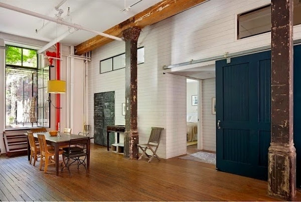 Cabe destacar las tuberías vistas y pintadas de rojo. Y la maravillosa puerta corredera.