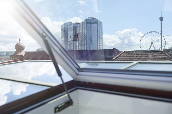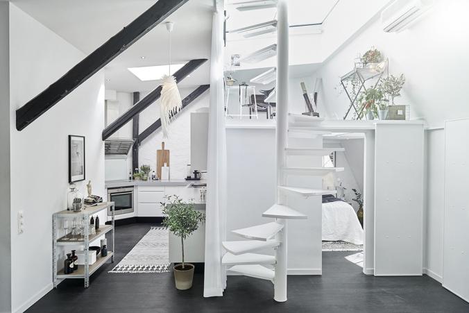 Una bonita y elegante escalera de caracol sube a una habitación superior polivalente y por la que entra una gran cantidad de luz gracias a los enormes tragaluces. Unas escaleras adicionales dan acceso a la azotea del edificio desde donde se puede contemplar los tejados del vecindario circundante.