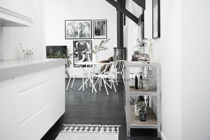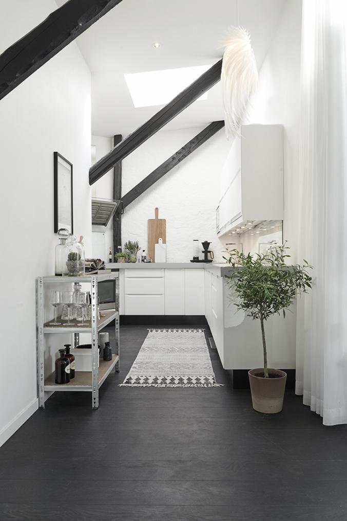 La estufa exenta aporta al ambiente un poco de calidez mientras que las vigas a la vista y en color negro le añaden carácter a la casa.