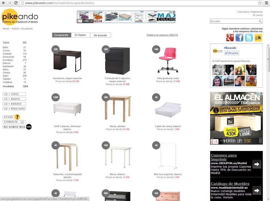 Pero hoy de lo que os quiero hablar es de un sitio web que he encontrado que a muchos os será útil, sobre todo a los amantes de Ikea. Yo estoy a favor del producto de Ikea para salvarnos de algunos apuros funcionales en casa. Pienso que Ikea es un buen lugar para encontrar muebles funcionales que necesitamos y por lo que no podemos pagar mucho, aunque la calidad de estos muebles no es buena el precio es competitivo. Eso sí, tendremos los mismos muebles en casa que tienen millones de personas. Sin embargo si queremos obtener muebles un poco más atractivos y con algo más de calidad, Ikea resulta algo caro en comparación con la competencia por lo que no merece tanto la pena comprar allí en estas circunstancias. Pero como ya sabéis que este blog fomenta el reciclado, la ecología y el ahorro, hoy os traigo una alternativa para esto. Se trata de un espacio web con el que me he topado y me ha parecido muy interesante y quizás muy útil para los afiliados a Ikea http://www.pikeando.com/ . Pikeando es una web donde encontrar muebles de Ikea de segunda mano en su mayoría a mitad de precio, podemos ver fotos del mueble correspondiente en el catálogo de Ikea y el mueble en concreto de quien lo vende. Una buena alternativa para conseguir muebles que esten en buen estado de Ikea y darles una segunda oportunidad que sus dueños de origen ya no encuentran en su casa Y bueno también os viene bien si, por el otro lado, queréis vender uno ¿Que os parece?