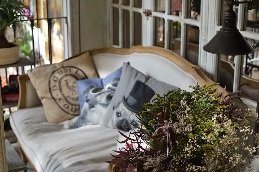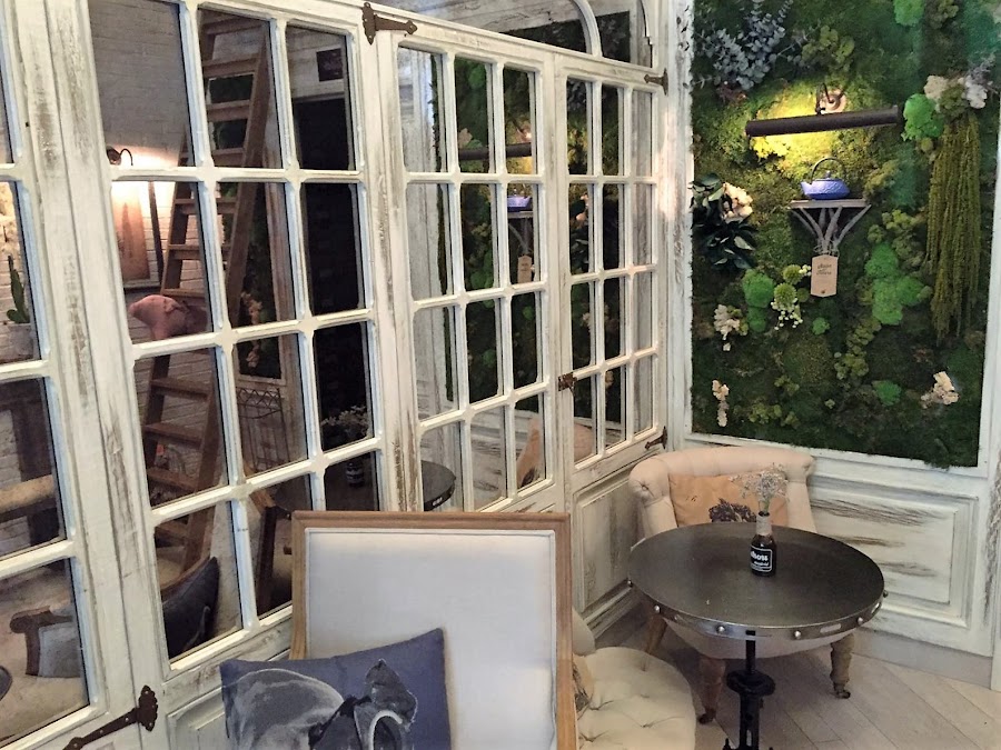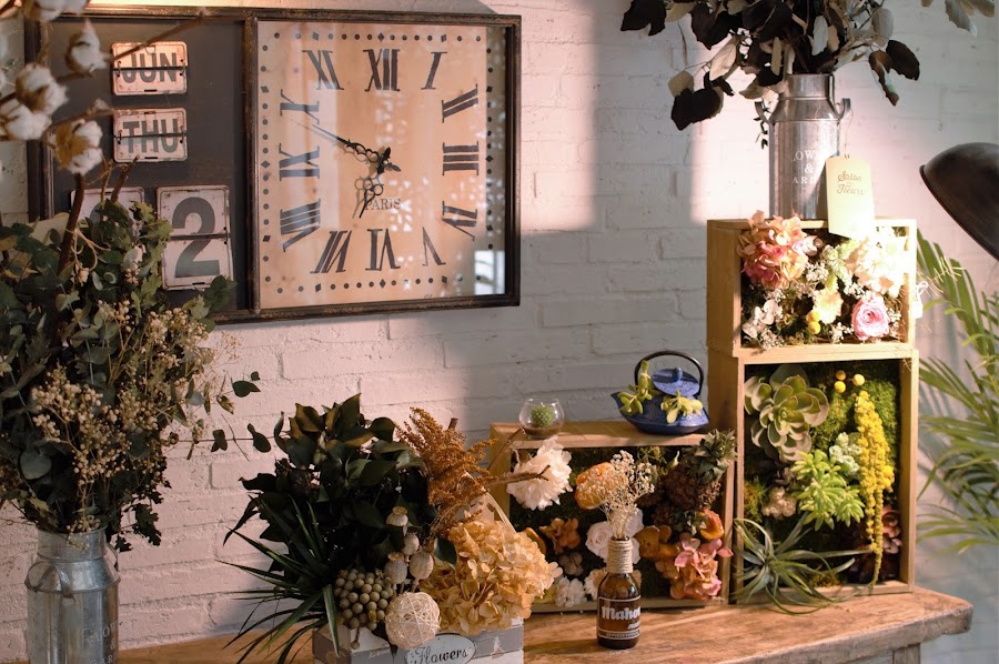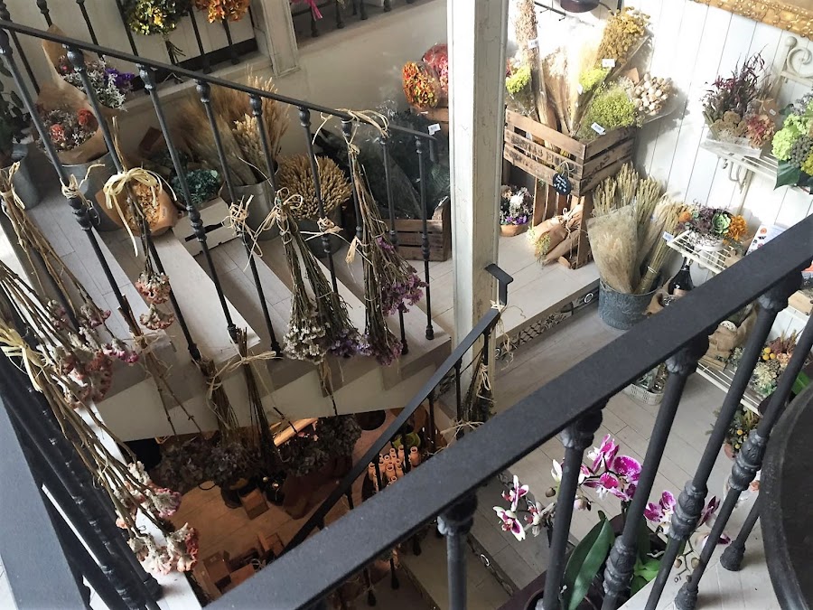 Todos los centros de flores y plantas que forman parte de la decoración están a la venta, pero subiendo la escalera de caracol encuentras la zona más comercial, con accesorios de decoración expuestos en vitrinas. Y por últitmo, el corazón de este negocio, su taller floral en la planta baja, donde crean todas las composiciones y además dan cursos, si os interesa, os dejo su web.