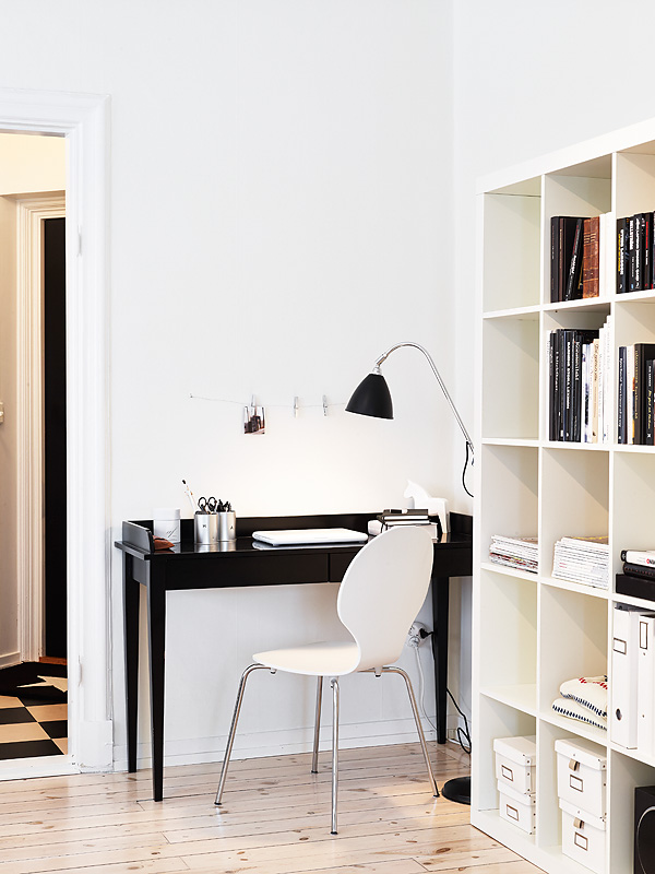 Me ha encantado el despacho integrado en el salón así como la mezcla de mobiliario, igual vemos un taburete de diseño como una mesa al mas propio estilo clásico renovado, eso sí sin salirse de la línea cromática Black & White, para tomar nota.