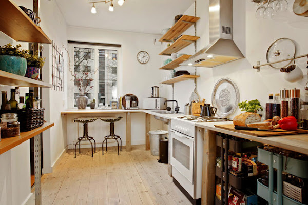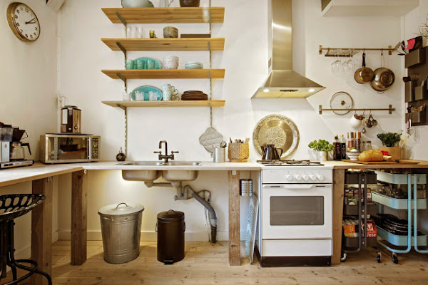 En la cocina, se han eliminado los muebles, y en su lugar se ha optado por instalar unas estanterías, que visualmente ocupan mucho menos espacio. También podemos ver como los carros Raskog de Ikea sirven de almacenaje para las especies y las sartenes .