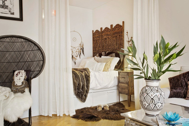Como véis, el salón y la habitación comparten espacio pero para separar ambientes se ha optado por colocar unas cortinas blancas, que a su vez, hacen de pared.