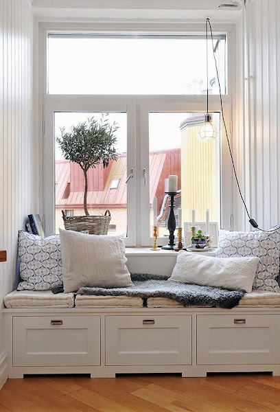 Será porque soy una romanticona ... pero este rincón siempre me ha parecido precioso, y muy práctico si aprovechas el espacio para guardar cosas en él. Los huecos de las ventanas pueden ofrecerte mucha funcionalidad.