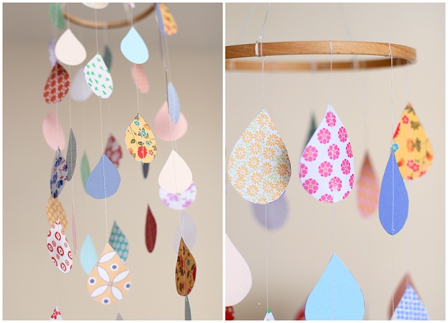Se trata de un mobil HANDMADE, para hacerlo solo necesitamos papeles estampados de colores, un bastidor de bordar y cuerda o hilo blanco.