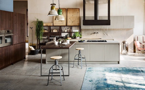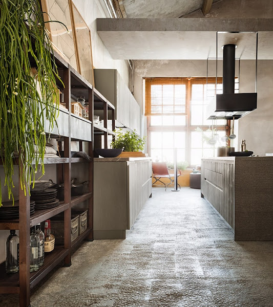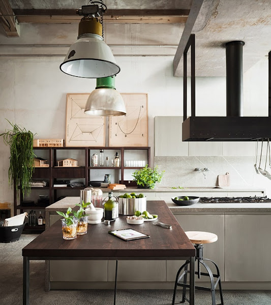 De aspecto urbano y cosmopolita, la composición está aderezada con una campana de isla de acero negro, una estantería abierta que deja a la vista ciertos elementos, una mesa, taburetes y dos lámparas también de estilo industrial pero diferentes entre sí.