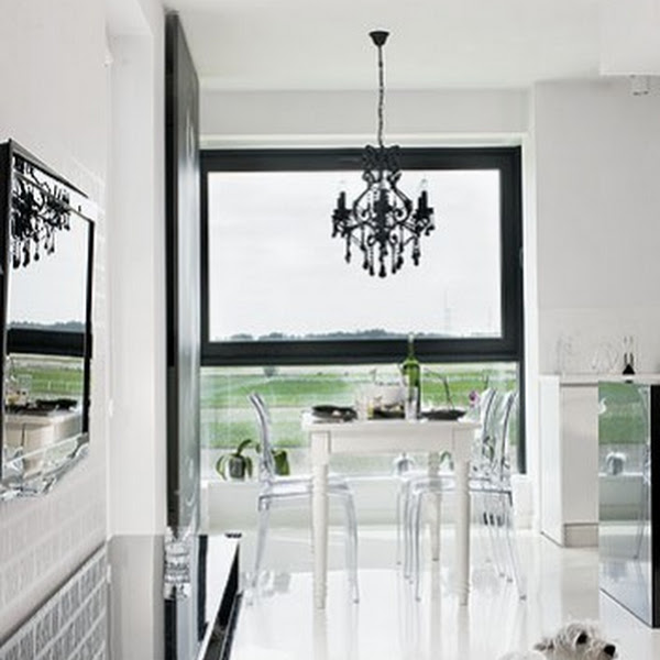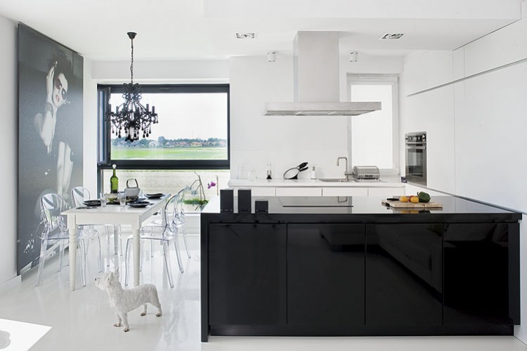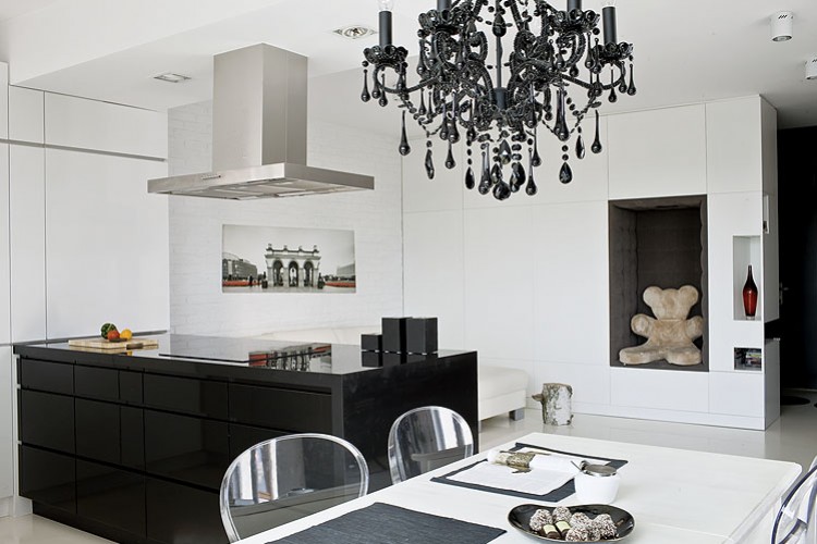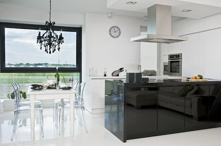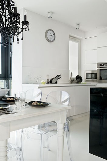 En la cocina destaca el moderno mueble lacado en negro y las sillas de policarbonato transparente que contrastan con la mesa blanca vintage y lámpara de araña en color negro.