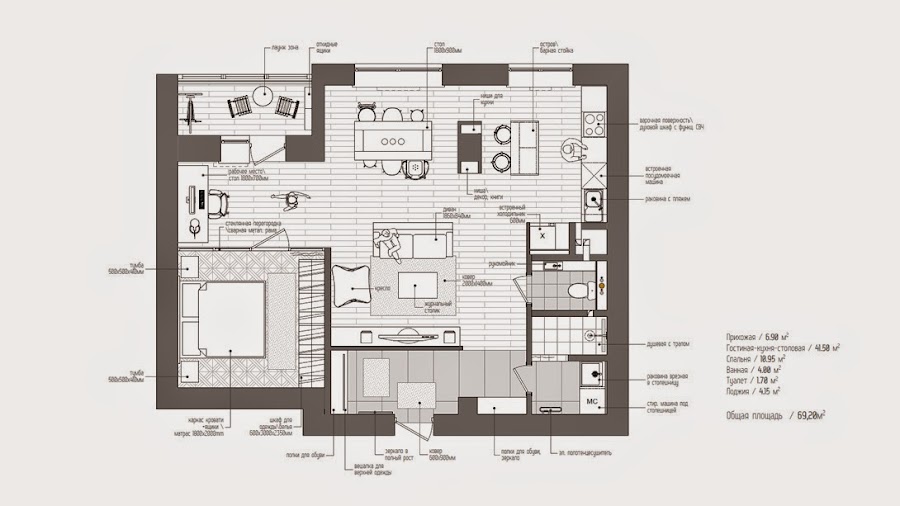 Volúmenes en gris sobre un fondo blanco y suelo en madera clara con pinceladas en rojo recorren todo el apartamento, que aunque a simple vista pudiera parecer mas grande tan solo tiene 69 m2.