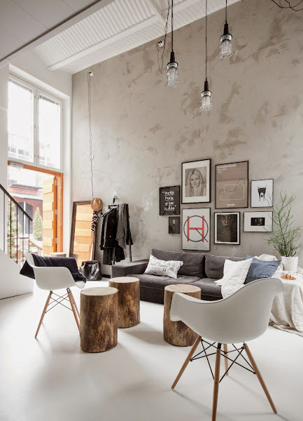 En general la decoración moderna de este loft me ha gustado mucho. A grandes rasgos trasmite mucho orden y consigue crear una sensación de comodidad. Pero os puedo contar solo algunas cosas de las que me han gustado porque si pusiera todas estaríais leyendo hasta mañana. Pues bien, una de las cosas que más me han gustado de este loft es el utilizar los troncos de árbol como mesitas. Os puedo asegurar que esta es una de las tendencias de decoración más al alza en este 2015. Podemos verlos últimamente en muchas decoraciones y con usos muy variados. A pesar de lo toscos que pueden parecer, ayudan a transmitir una sensación natural, fresca e incluso ligera.