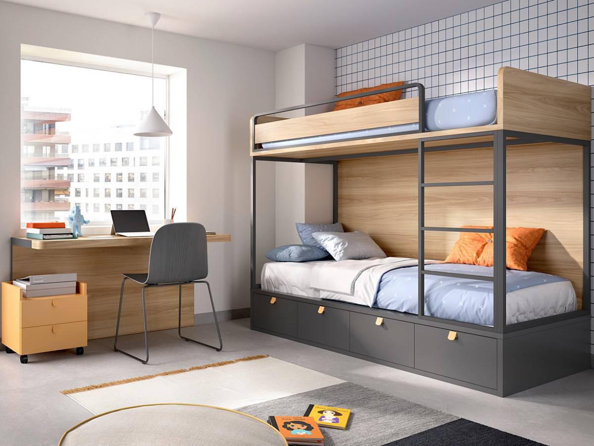 Literas: Son perfectas para hermanos que comparten habitación, ya que aprovechan el espacio vertical, dejando más área libre para jugar y moverse. Las literas modernas pueden incluir cajones y estanterías integradas para almacenamiento adicional.