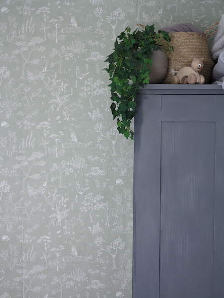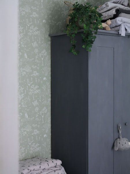 Cuando Sand berg quiso colaborar conmigo fue todo un honor, nunca pensé que en la habitación de Aria habría uno de sus preciosos papeles pintados. Sand berg es una empresa de papeles pintados sueca muy conocida, tiene una multitud de diseños preciosos que diseñan ellos mismos, y en mi opinión son muy especiales sus papeles para habitaciones infantiles. Para Aria elegí el diseño de Hollie en el tono verde. Le ha dado un punto de luz a la habitación y un toque diferente con su impresión de animales del bosque. La primera vez que lo vio Aria se le abrieron mucho los ojos y dijo "oooohhh",ahora lleva como tres días acariciando la pared, jajaja, así que creo que hemos acertado de pleno!