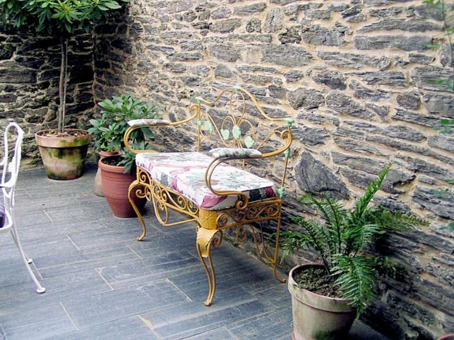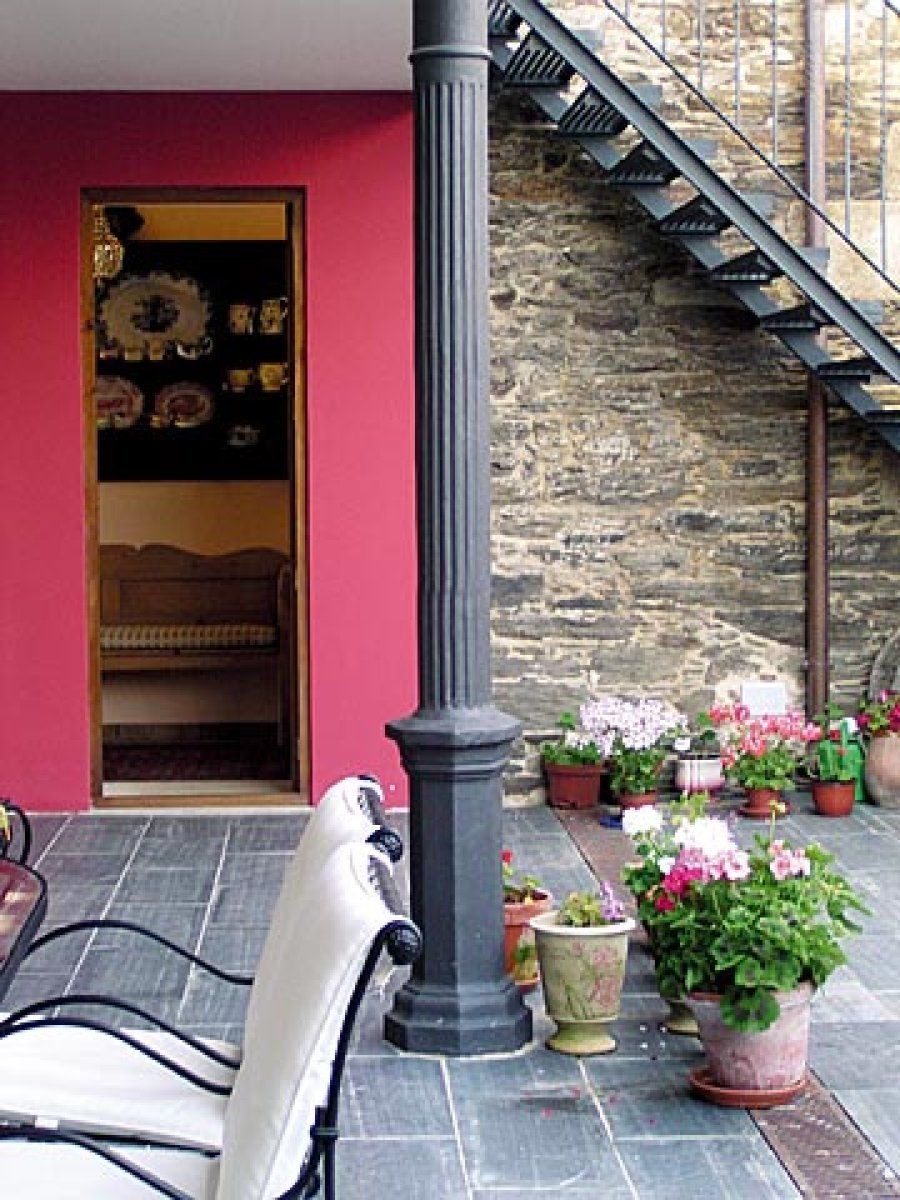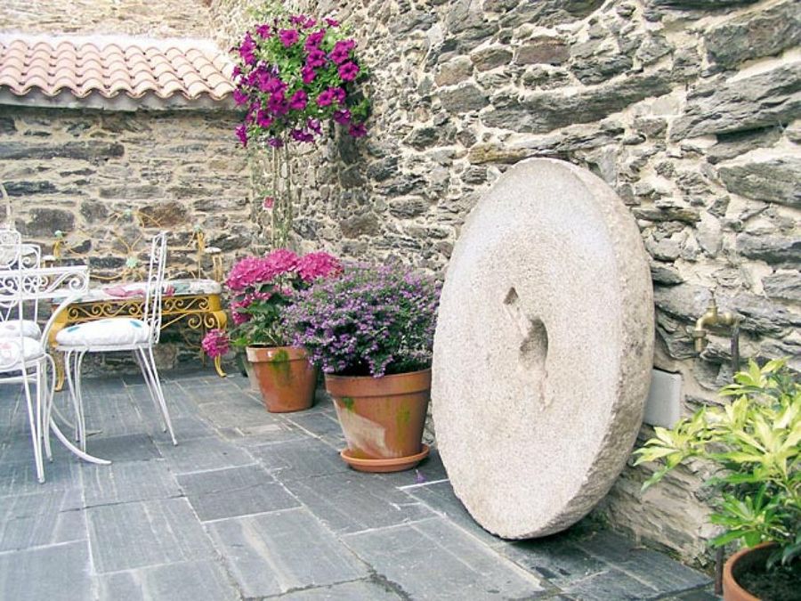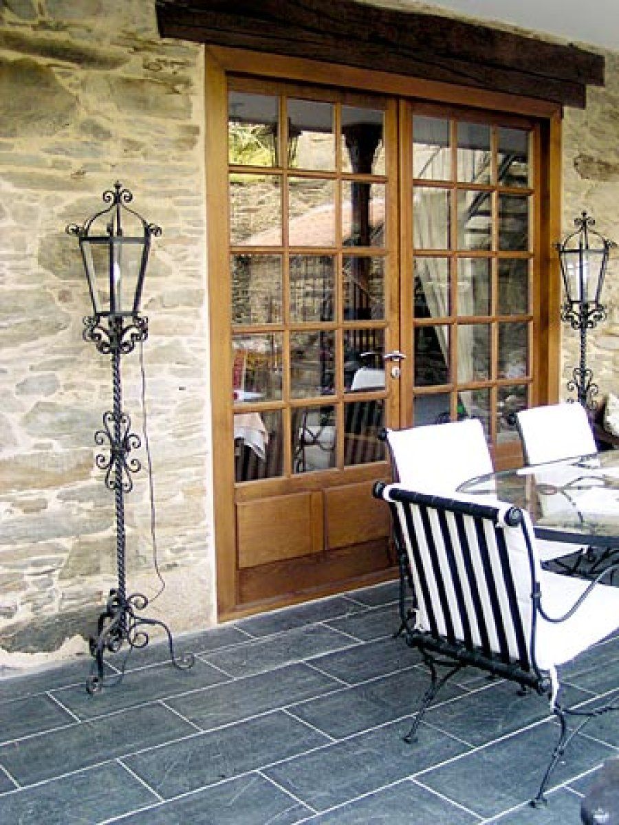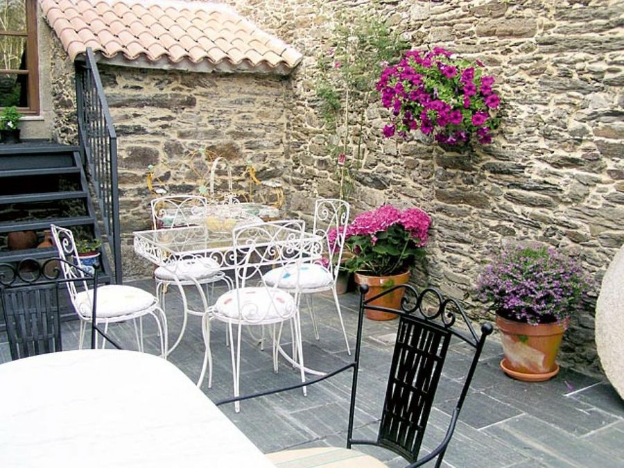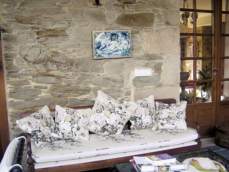 La luz incide en él de manera indirecta debido a los muros que lo resguardan y que cercan la vivienda. Son de piedra gallega y el cemento del suelo se ha sustituido por pizarra, un material que habitualmente se utiliza para las cubiertas de los tejados. Duro y resistente, pero acogedor y decorativo al mismo tiempo.