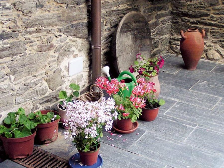 Las plantas de colores y en perfecto estado hacen pensar que llevan allí toda la vida. Los coloridos geranios dejan caer sus hojas en el suelo de pizarra como si sus pétalos formasen parte del decorado.