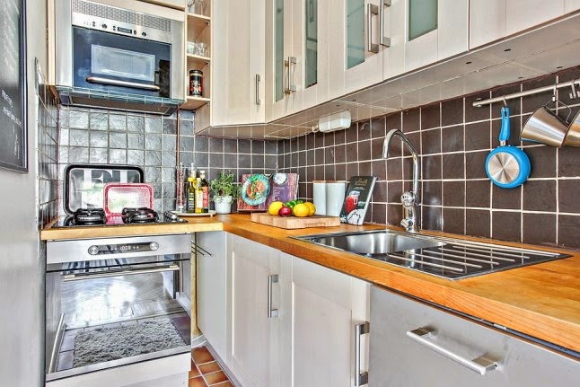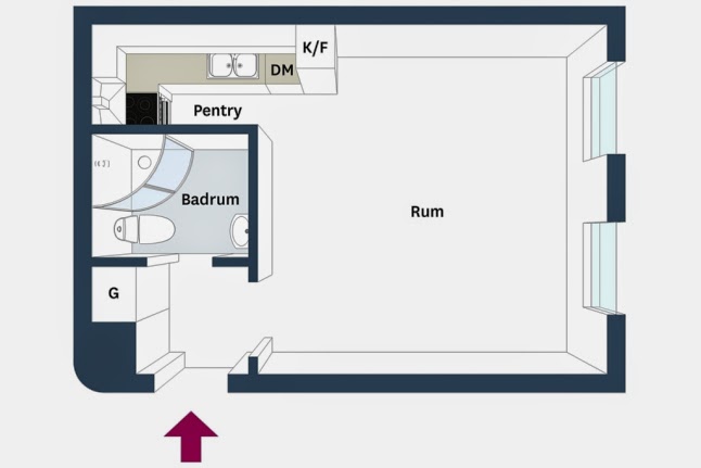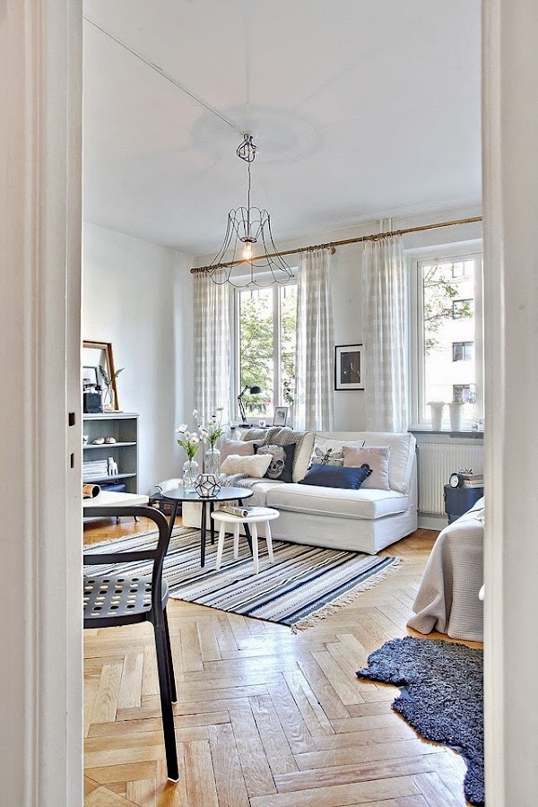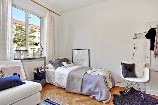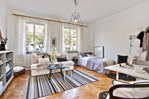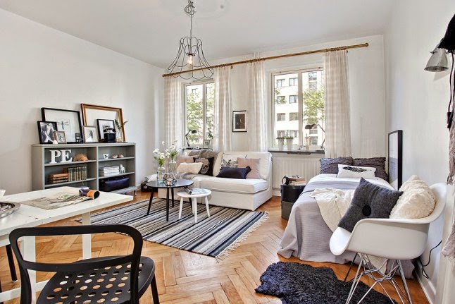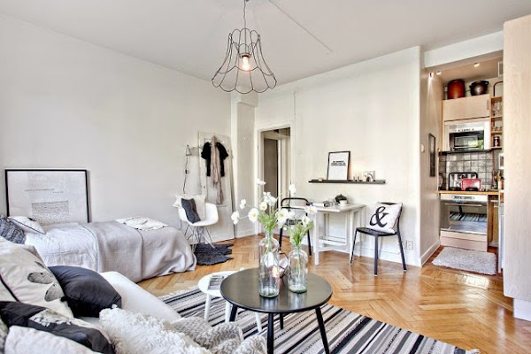 Seguramente a primera vista no os parecerá un estudio tan pequeño, pero tan solo tiene 27 metros cuadrados. La clave para esa sensación de amplitud es crean un espacio único en el que se distribuyen salón, dormitorio y zona de estudio, algo muy típico en la decoración de apartamentos del Norte de Europa. Como podréis comprovar en las imágenes la mayor parte de metros se destinan a la zona de living, reservando tan solo unos pocos para un diminuta, pero práctica cocina. La ausencia de separación de estancias y la utilización del blanco, contrastado con tonalidades de grises, crea una luminosidad y sensación de amplitud en todo el estudio. También ayuda a la hora de decorar la utilización de mobiliario sencillo, que no recarga visualmente el espacio.