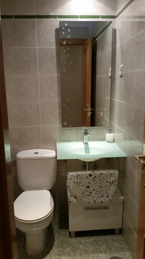 Un espejo con pequeñas estrellas a juego con la toalla de Zara Home, lavabo de Leroy Merlin en tonos que combinan a la perfección con el resto del aseo. Bajo el lavabo un pequeño mueble (también de Leroy Merlin) que aporta funcionalidad sin sobrecargar debido a su diseño y pequeño tamaño.