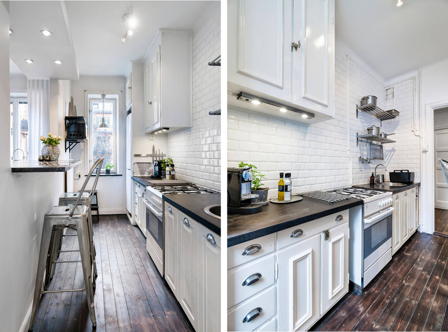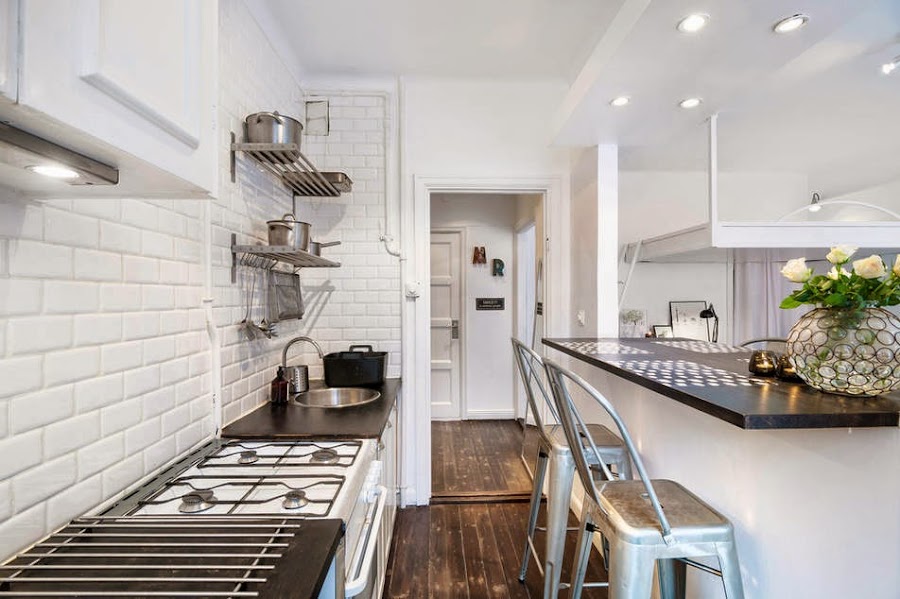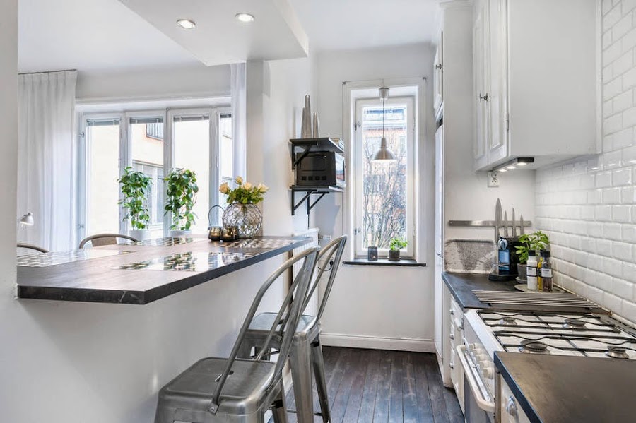 La estrecha cocina se abre al salón con un gran pasa-plato, que además hace las veces de mesa en la zona del salón con unos taburetes metálicos tipo industrial.